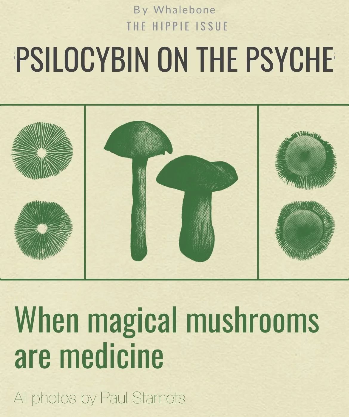Interview: Psilocybin on the Psyche When magical mushrooms are medicineLink: https://whalebonemag.com/psilocybin-on-the-psyche/ Chloe PalkaOctober 28, 2021 Facebook0 Twitter LinkedIn0 Reddit Tumblr 0 Likes